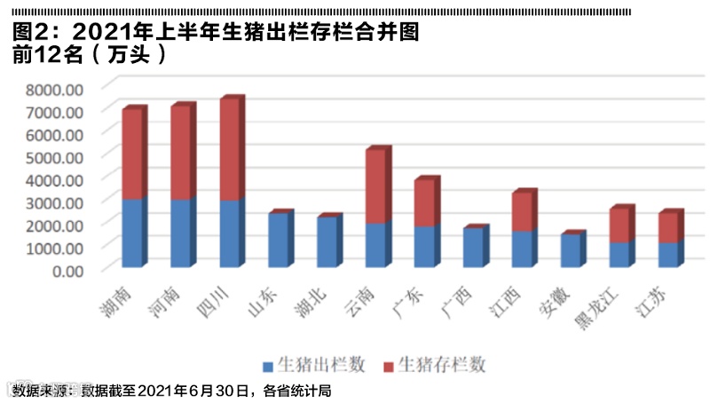 作为中国生猪/猪肉生产三大省的四川、河南、湖南,上半年在出栏和存栏方面都继续领先其他省份,特别是四川,其6月存栏数第一,将支持其在全年数据的高度,推测将达历史新高,或超过7000万头出栏数。由于山东、湖北的6月底存栏数据缺失,无法测算这两省的年出栏量(图2)。即使如此,四川生猪出栏量大概率将继续保持全国第一。