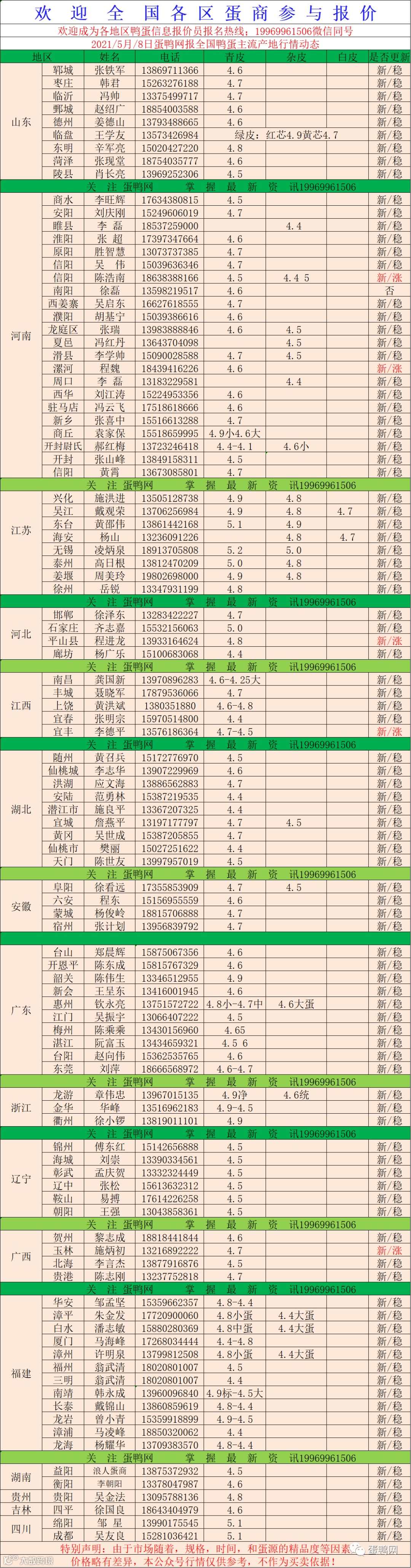 2021年5月8日鲜鸭蛋价格:初产4.9至大蛋4.5(鸭蛋价格仅供参考)。