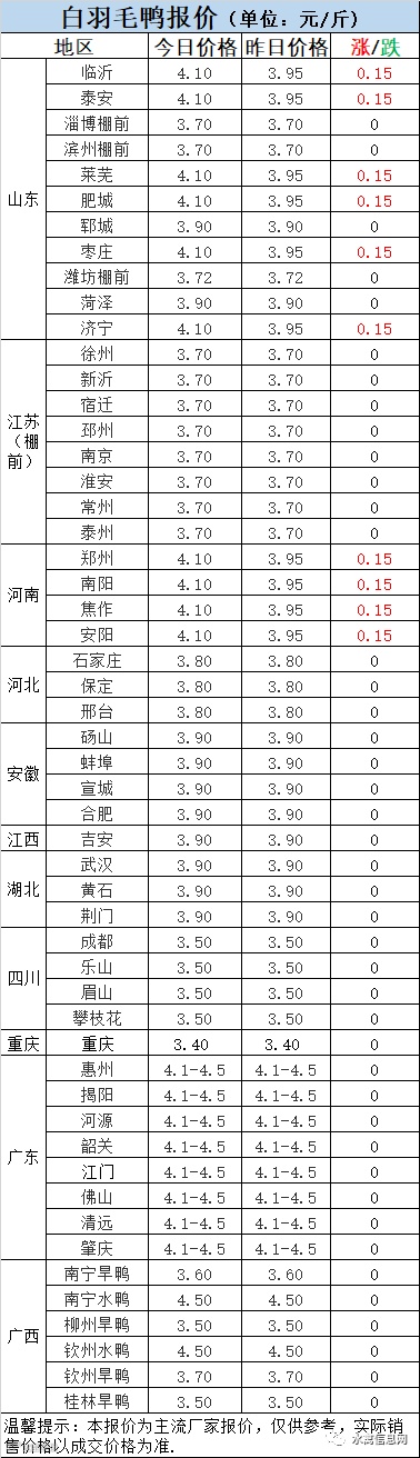 1:今晚北方毛鸭报价稳中走强,山东全面上涨,周边区域局部飘红。疾病严重,饲料高位,导致合同鸭回收成本持续高位,产品低位运行,冷藏日子依然艰难。