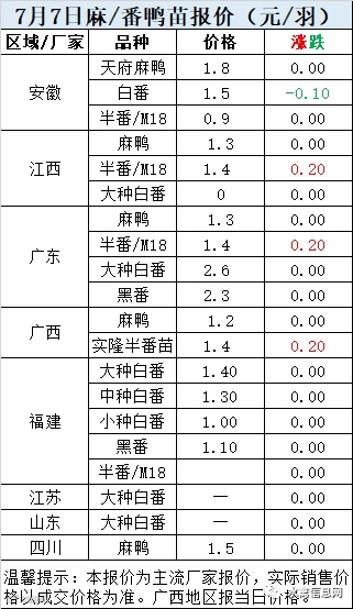 明日麻鸭苗报价稳定。半番鸭苗上涨0.2元/羽。