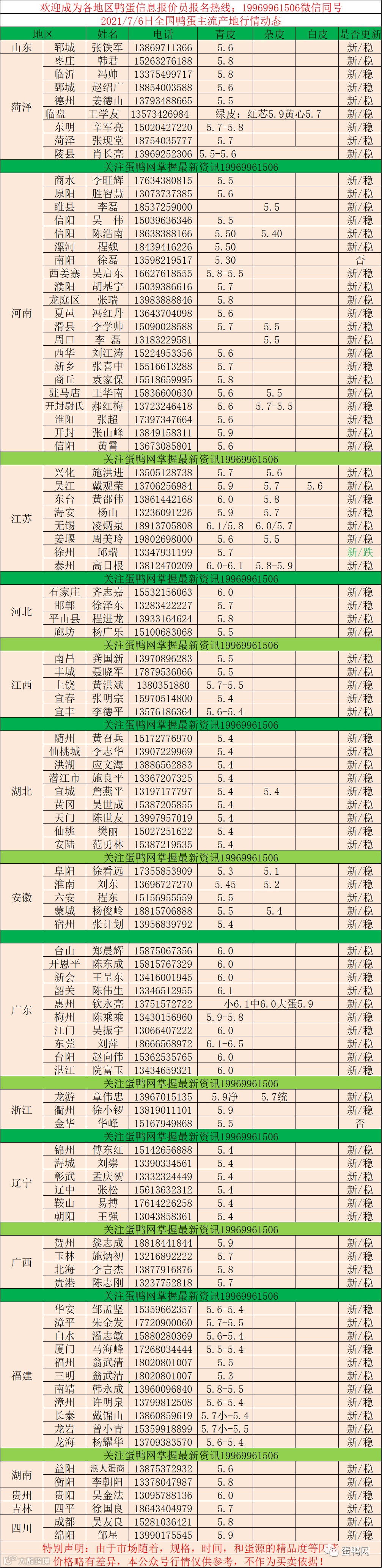 2021年7月6日鲜鸭蛋价格:初产至大蛋5.4(鸭蛋价格仅供参考)。