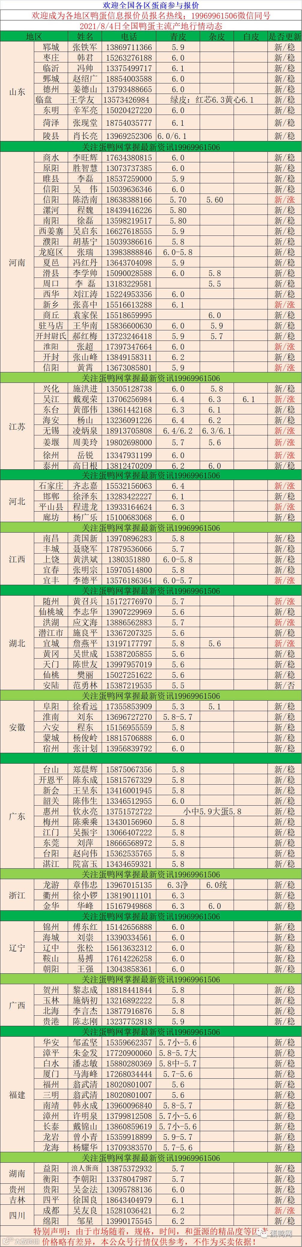 2021年8月4日鲜鸭蛋价格:初产至大蛋6.0(鸭蛋价格仅供参考)