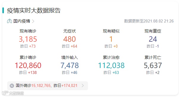 江苏省卫健委8月2日通报,8月1日0时至24时,江苏新增本土确诊病例40例(南京市报告11例,淮安市报告3例,扬州市报告26例),11例为轻型,29例为普通型。新增本土无症状感染者2例(均为扬州市报告)。7月20日至今,南京市累计报告本土确诊病例215例(其中轻型81例、普通型127例、重型7例)。