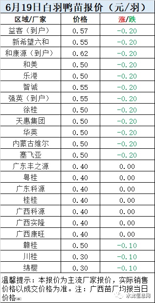 一、6月19日白羽鸭苗报价