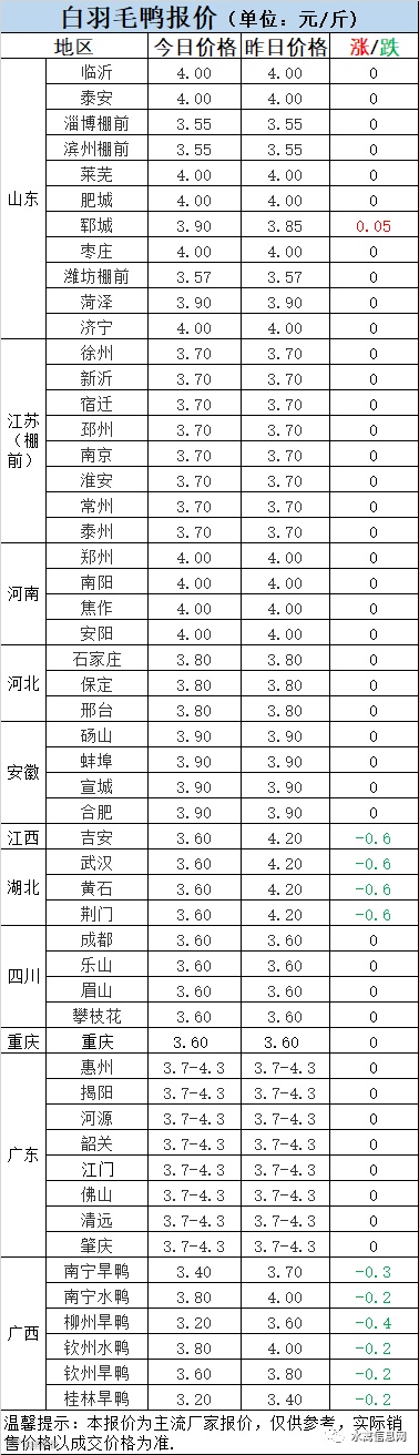 1:今晚北方毛鸭报价小幅下调。江淮主产区迎来降雨降温,出栏较平稳。疾病严重,饲料高位,导致合同鸭回收成本持续高位,产品低位运行,冷藏日子依然艰难。