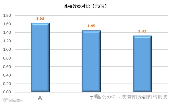 随档次降低,养殖收益逐步降低,低档VS高档差异-0.31元/只,效益低19%。