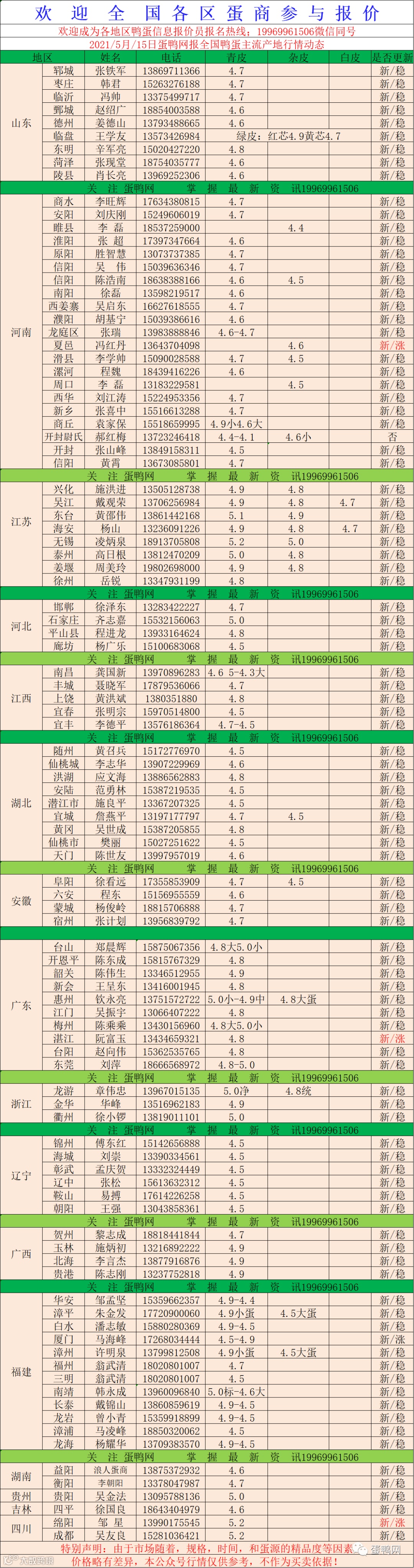 2021年5月14日鲜鸭蛋价格:初产5.0至大蛋4.5(鸭蛋价格仅供参考)。