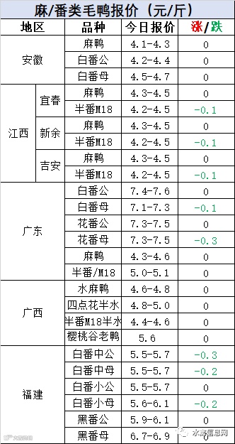1:今晚北方毛鸭报价小幅上涨。高温逐渐过去,出栏情况趋于平稳,回收价格略涨。