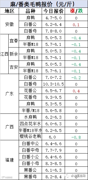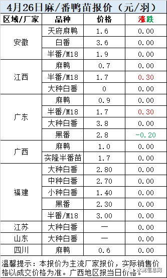 明日麻鸭苗报价稳定。半番鸭苗报价上涨0.3元/羽。