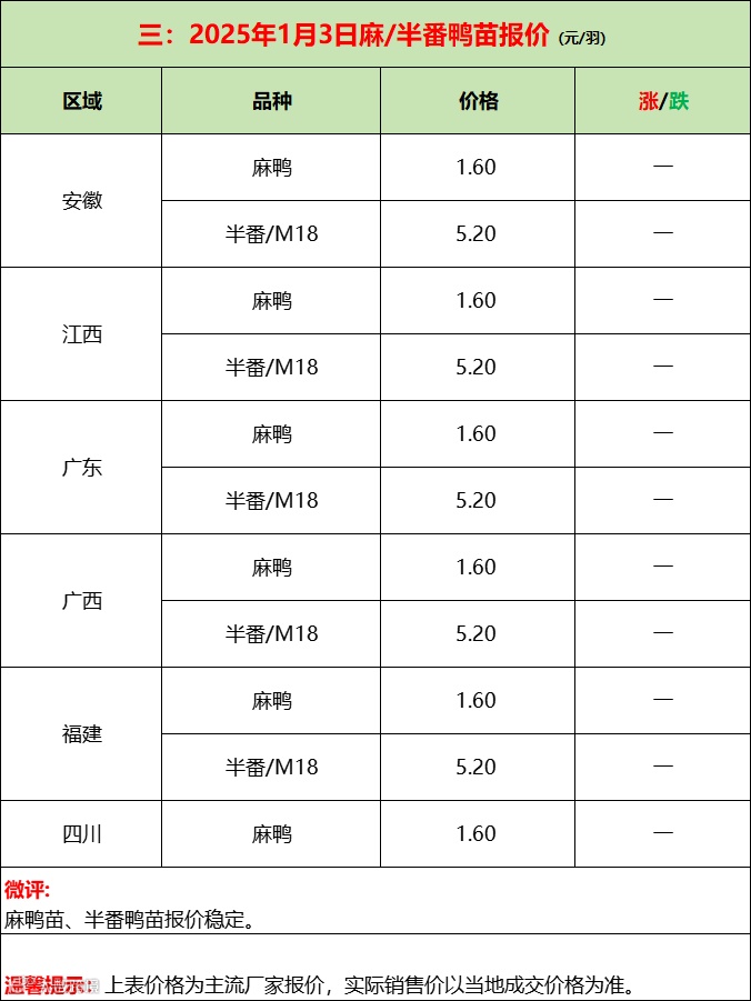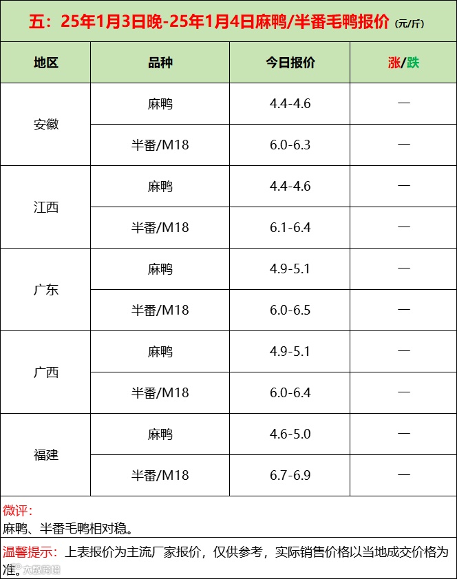 鸭苗底部反弹上涨;产品疲态不振!--2025年1月4日水禽行情简报