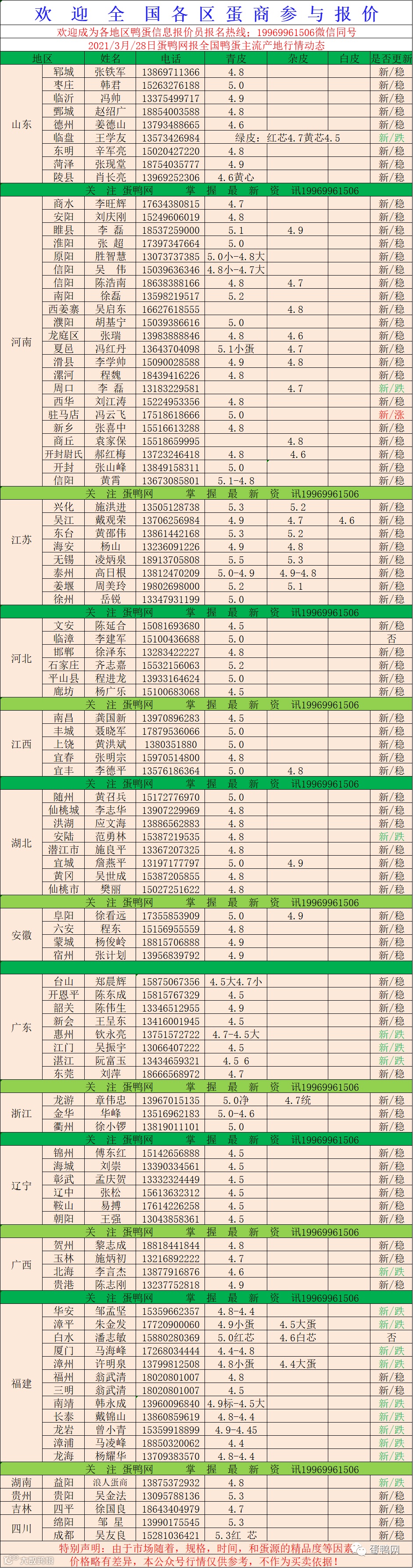 2021年3月28日鲜鸭蛋价格:初产至大蛋4.5(鸭蛋价格仅供参考)。