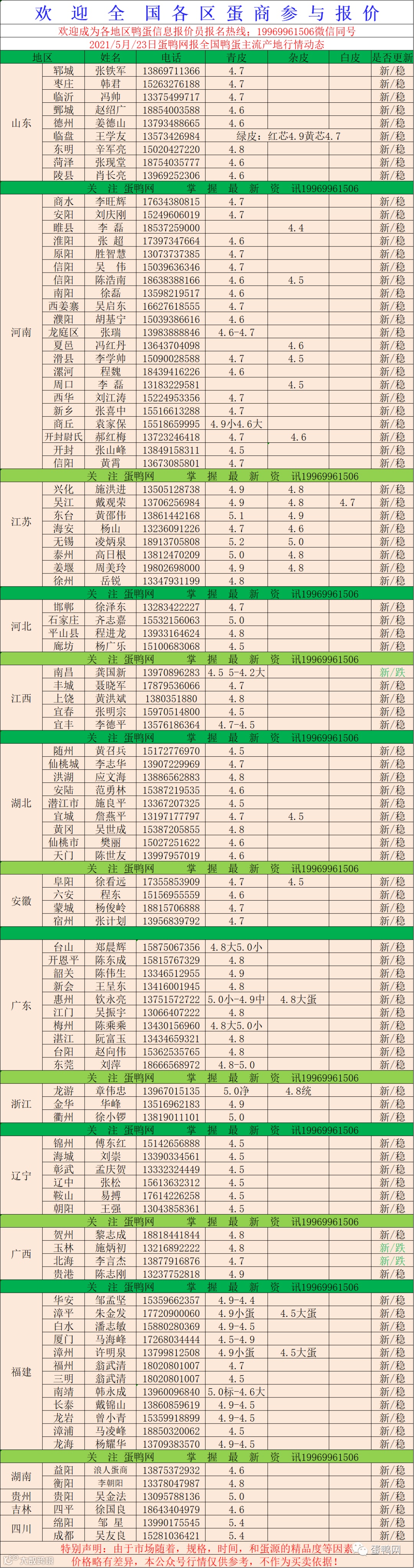 2021年5月23日鲜鸭蛋价格:初产4.8至大蛋4.5(鸭蛋价格仅供参考)。