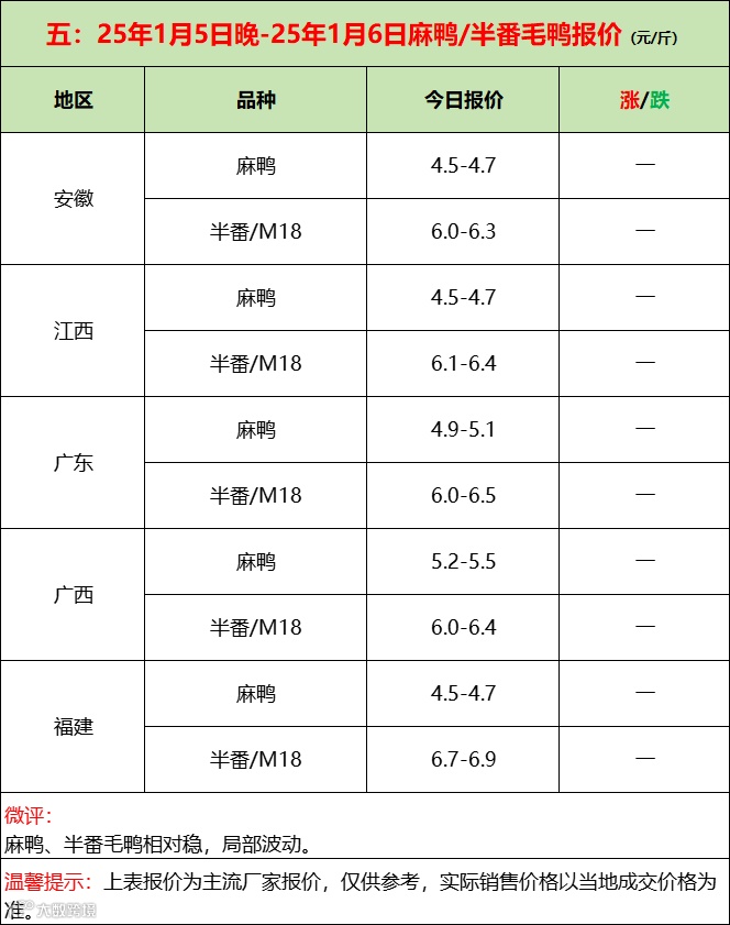 鸭苗谨慎上涨,产品低位徘徊!--2025年1月6日水禽行情简报