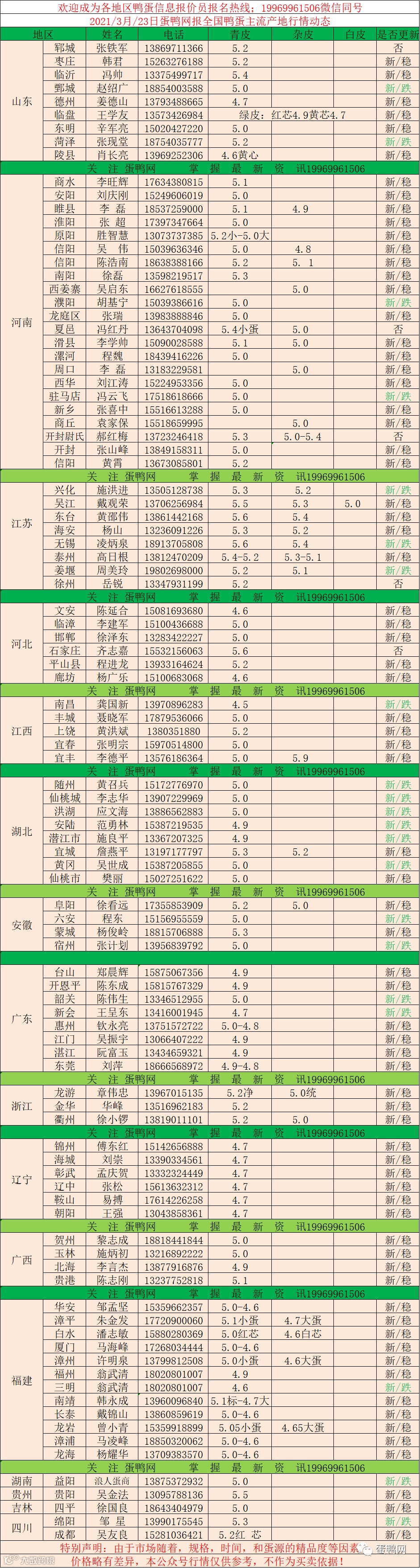 2021年3月23日鲜鸭蛋价格:初产至大蛋4.7(鸭蛋价格仅供参考)。
