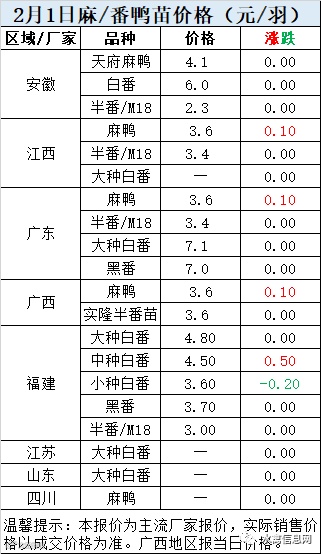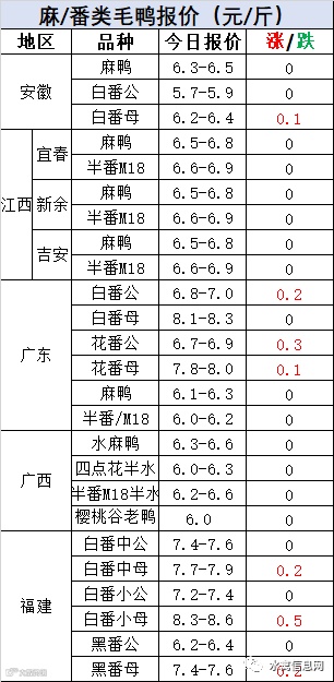 明日:麻鸭报价上涨0.1元/羽、半番苗报价稳定。