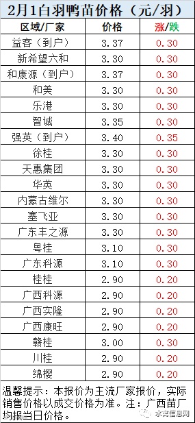 明日樱桃谷鸭苗全线上涨0.2-0.3元/羽。北方部分厂家二次涨价,涨幅达0.35元/羽。