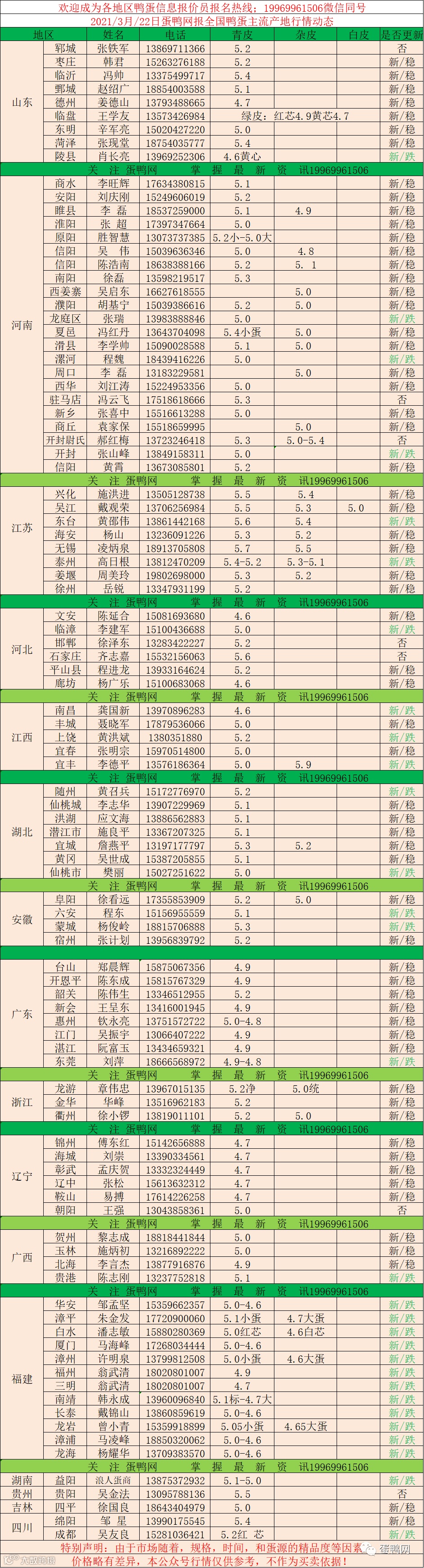 2021年3月22日鲜鸭蛋价格:初产至大蛋4.7(鸭蛋价格仅供参考)。