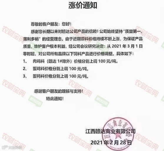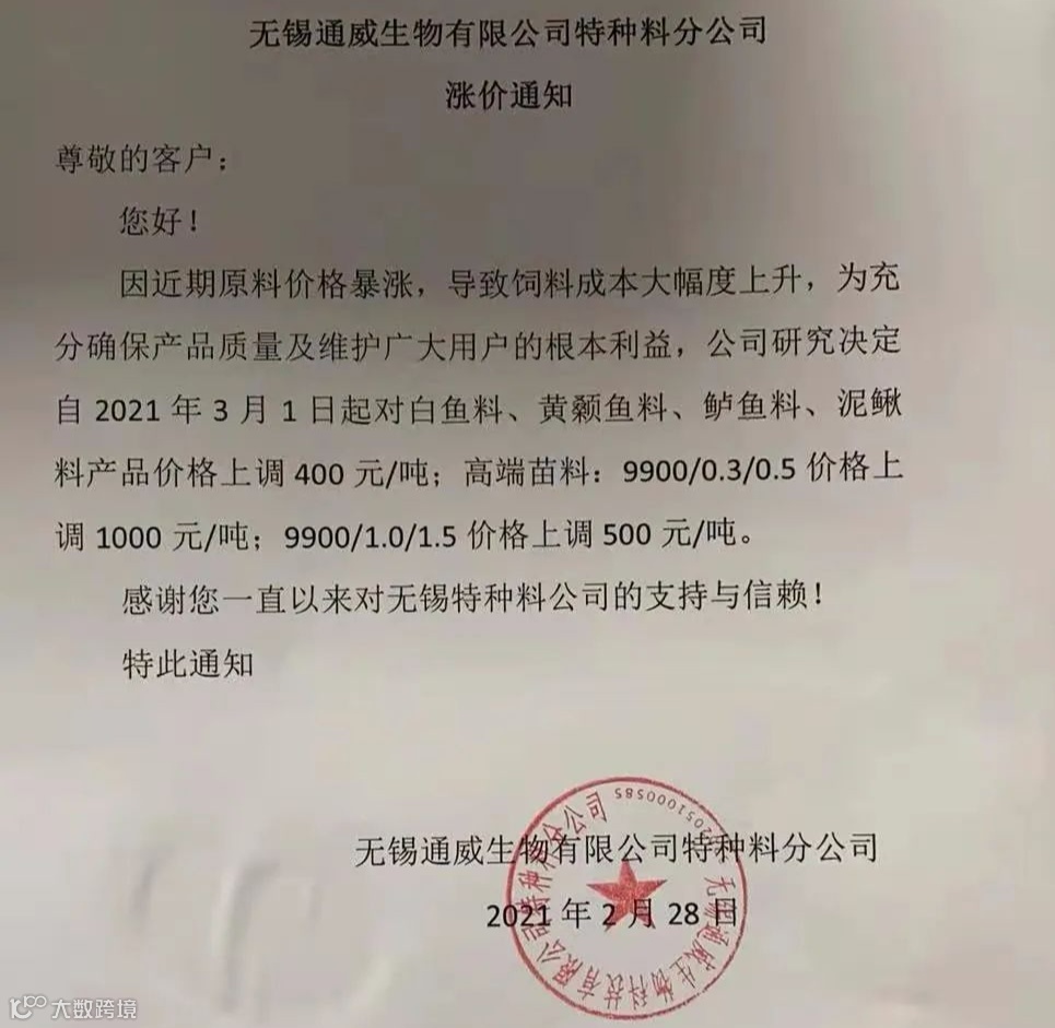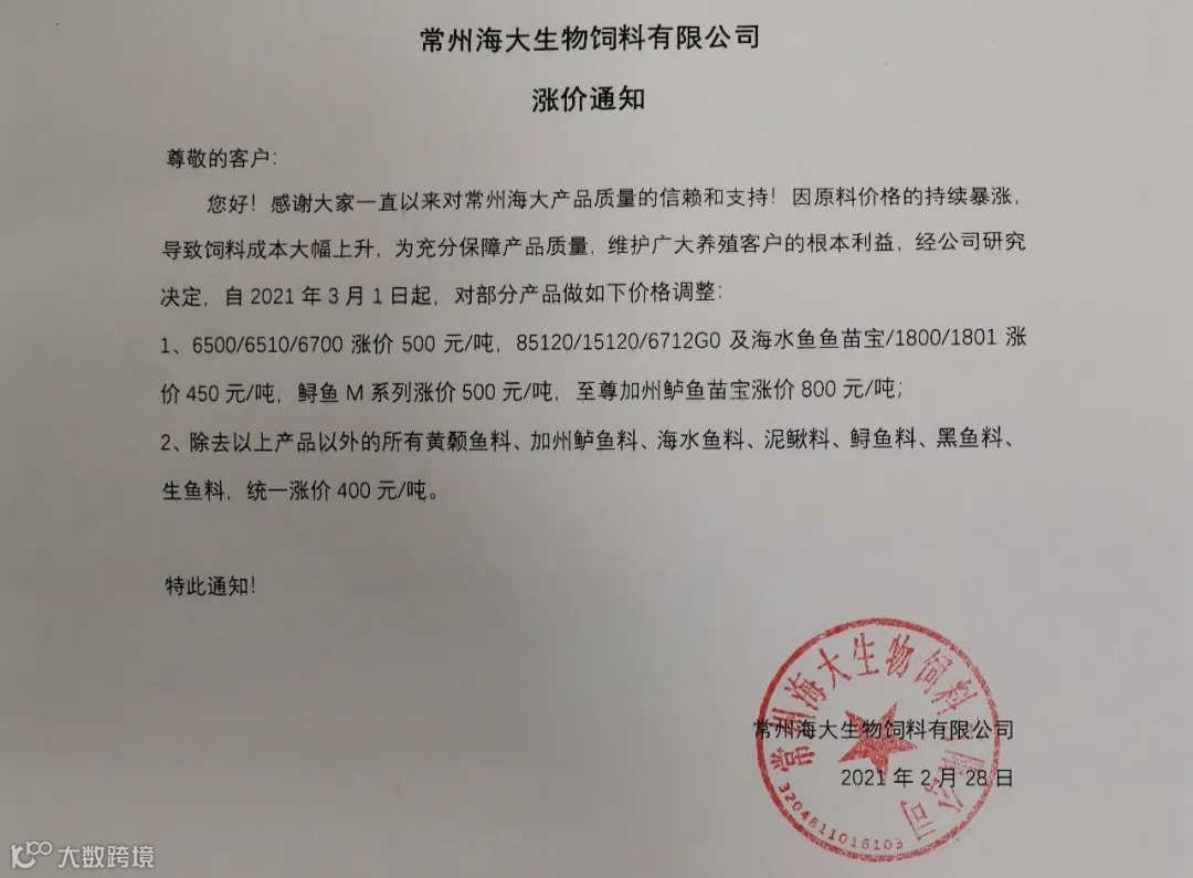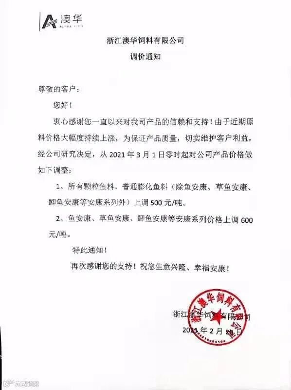 值得注意的是,由于原料的持续上涨,近期水产饲料涨价潮已经掀起。2月20日至今,多家水产饲料厂商集中发布提价函称,由于原料成本大幅上涨,公司对水产饲料价格进行上调。