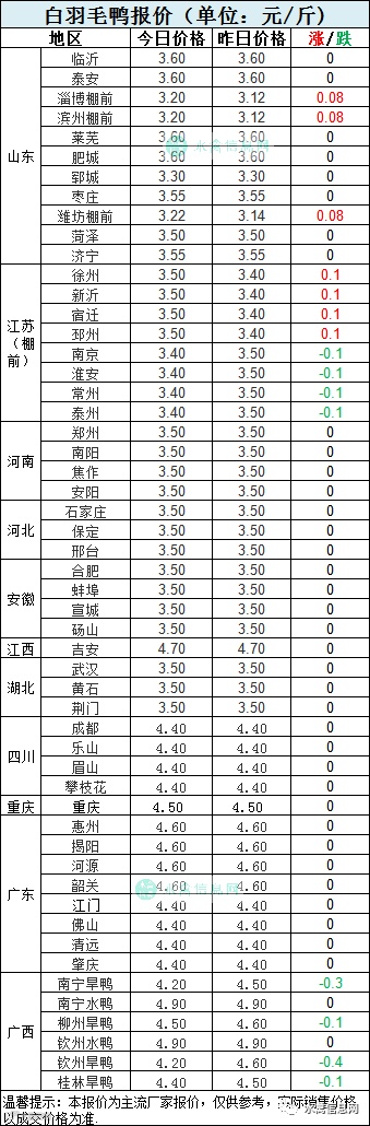 1:今晚分割鸭区域,山东棚前、苏北上涨回暖,其他区域涨跌调整。