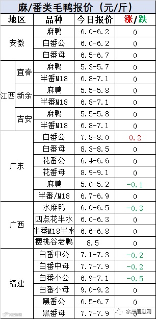明日麻鸭苗报价,江西下调0.1元/羽,其他区域稳定,整体仍处于低谷。