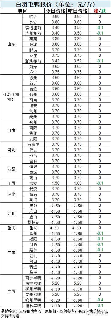 广东地区近期供需两端博弈剧烈,价格波动严重,整体大体重鸭走货较好,今晚报价局部下调0.1元/斤。广西地区报价整体稳定向好,但旱鸭仍有局部追跌调整。