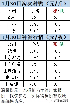 一、1月29日晚至1月30日 白羽肉鸭报价