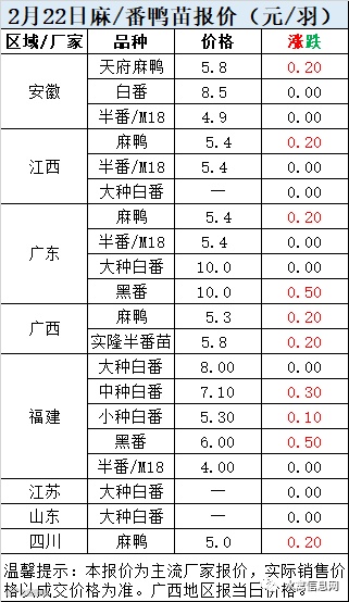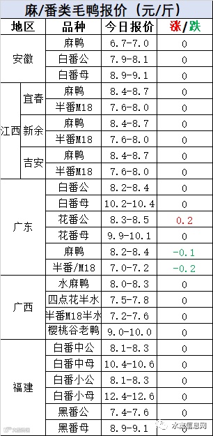 明日麻鸭苗继续上涨0.2元/羽,半番鸭苗报价稳定。