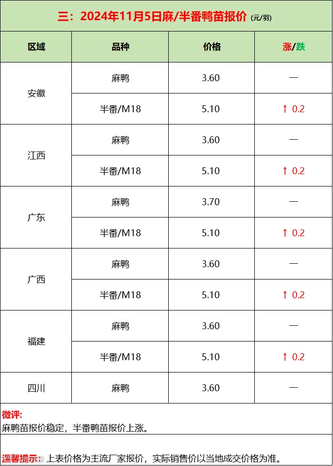 苗蛋稳定,产能还在扩张,风险累积攀升!--2024年11月6日水禽行情简报