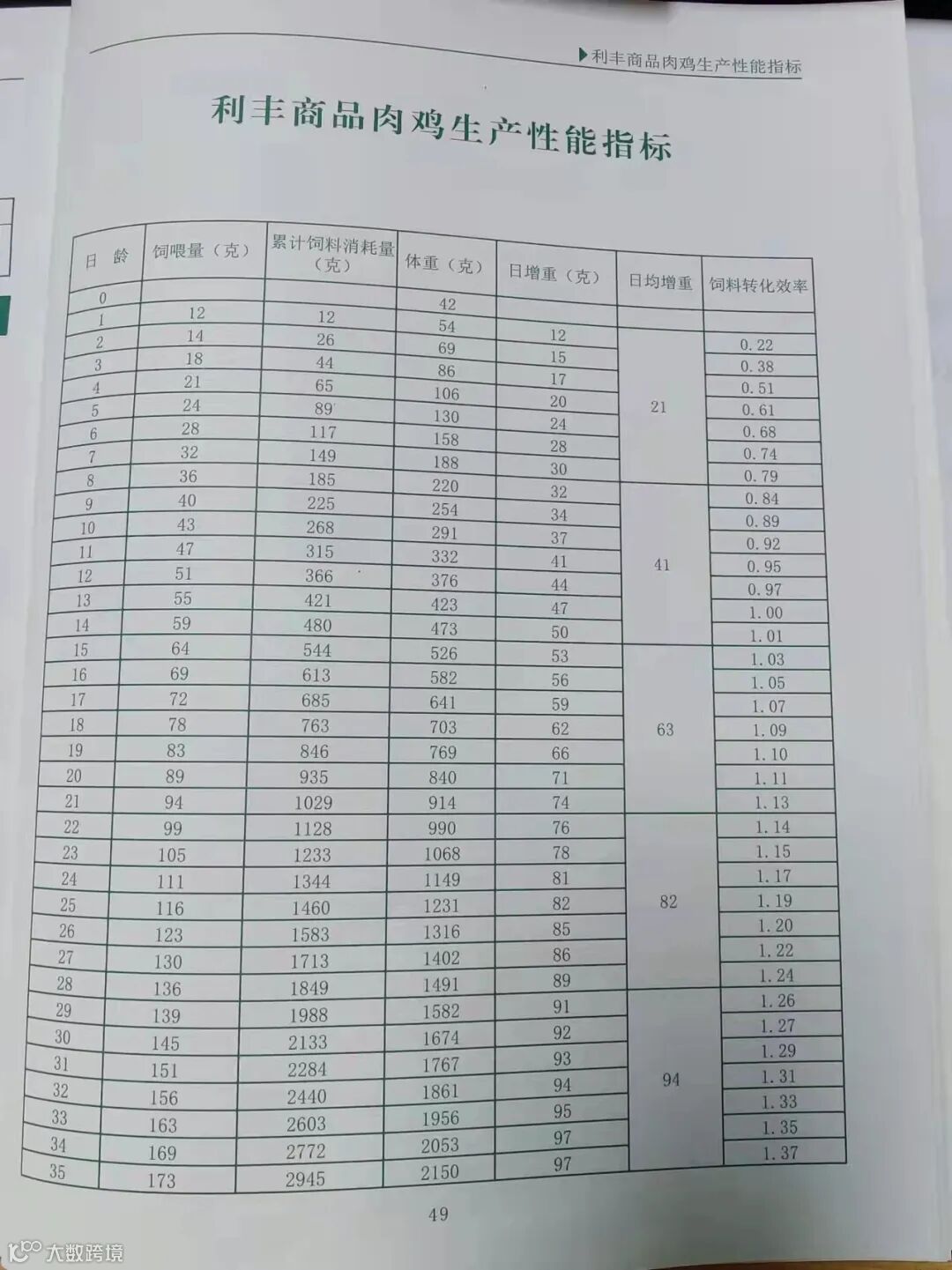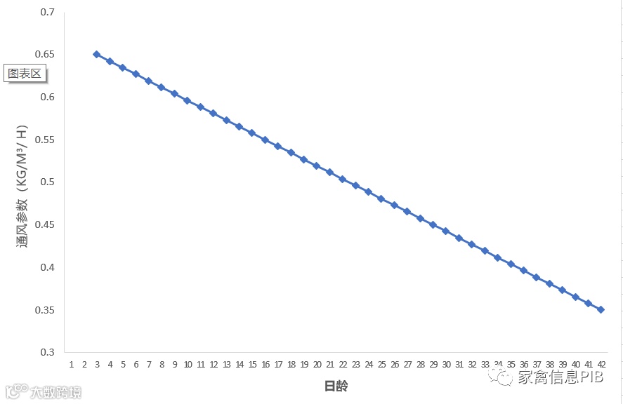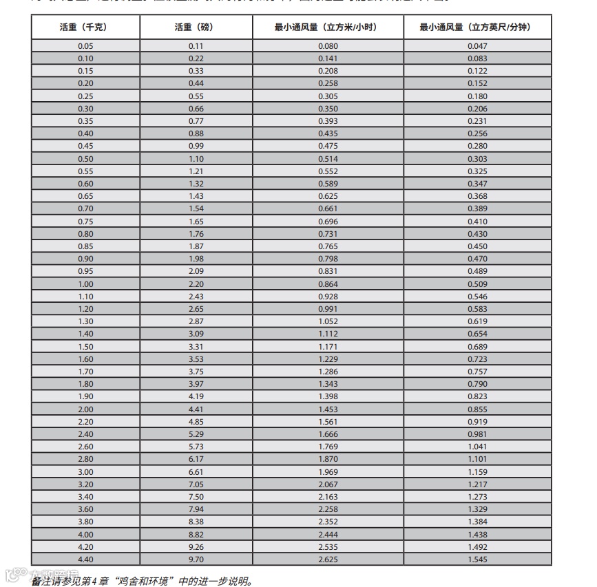 上面的公式涉及三个变量:肉鸡平均体重(根据各育种公司给的每日龄生产性能表来确定,如下图的益生利丰生长性能表);全舍鸡数这个好确定,还有通风系数。