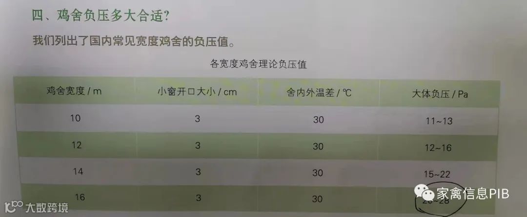 鸡舍密封好后,上面我们举例的鸡舍宽度是16米,根据以往负压测试,负压大致范围在20-28Pa,常见宽度鸡舍负压如下: