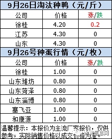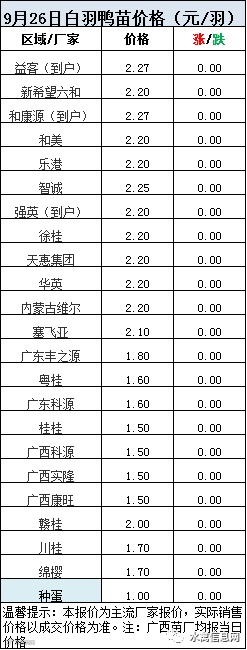 一、2020年9月26日白羽鸭苗报价;