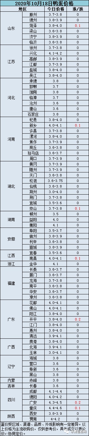 2020年10月18日淘汰蛋鸭价格参考值:5.8元/斤。受肉鸭活禽价格下跌影响叠加淘鸭增多种鸭淘汰乱市,淘汰蛋鸭持续弱势震荡。