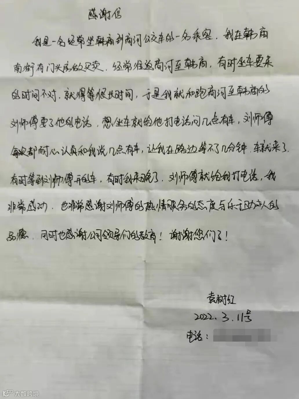 袁女士在韩庙街头有门头房做买卖,经常往返商河至韩庙,有时错过一班车就会等很长时间,于是她就向商河至韩庙线路的驾驶员刘继升师傅要了联系方式,想坐车就询问刘师傅几点有车,刘师傅每次都耐心的回答。有时等到刘师傅的班次,袁女士来晚了,刘师傅就给袁女士打电话,袁女士非常感动,也非常感谢刘师傅的热情服务的态度与乐于助人的品德,特地为刘师傅写了一封感谢信,表达谢意。