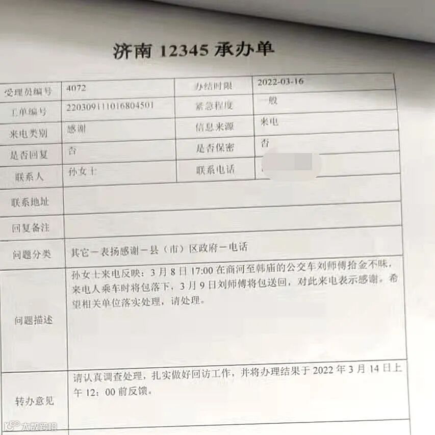 3月8日下午,孙女士在乘坐商河至韩庙的公交车时,不慎将包落在车上,驾驶员刘师傅发现后,联系到孙女士将包归还,孙女士特地来电表示感谢。