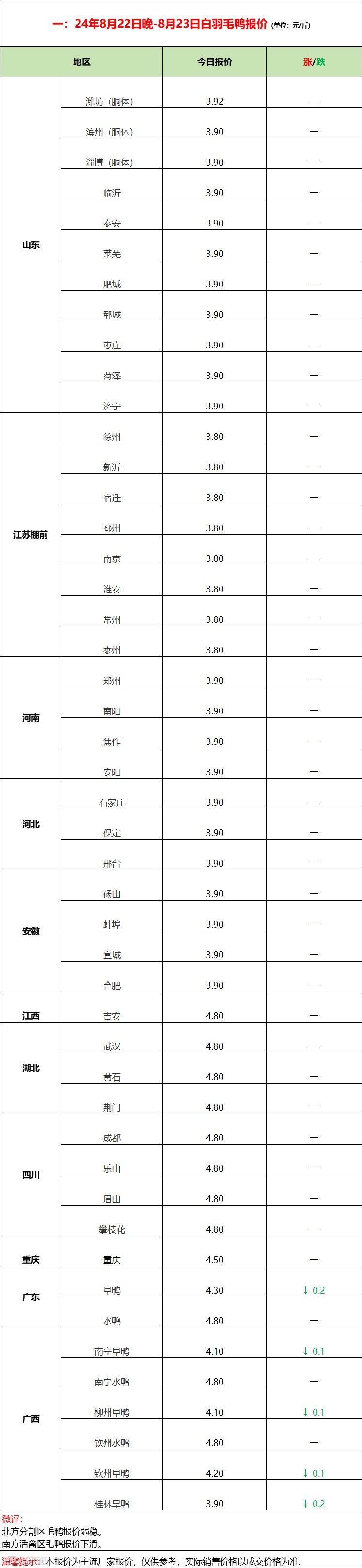鸭苗分化,北涨南稳;产品弱稳,波澜不惊!--2024年8月23日水禽行情简报