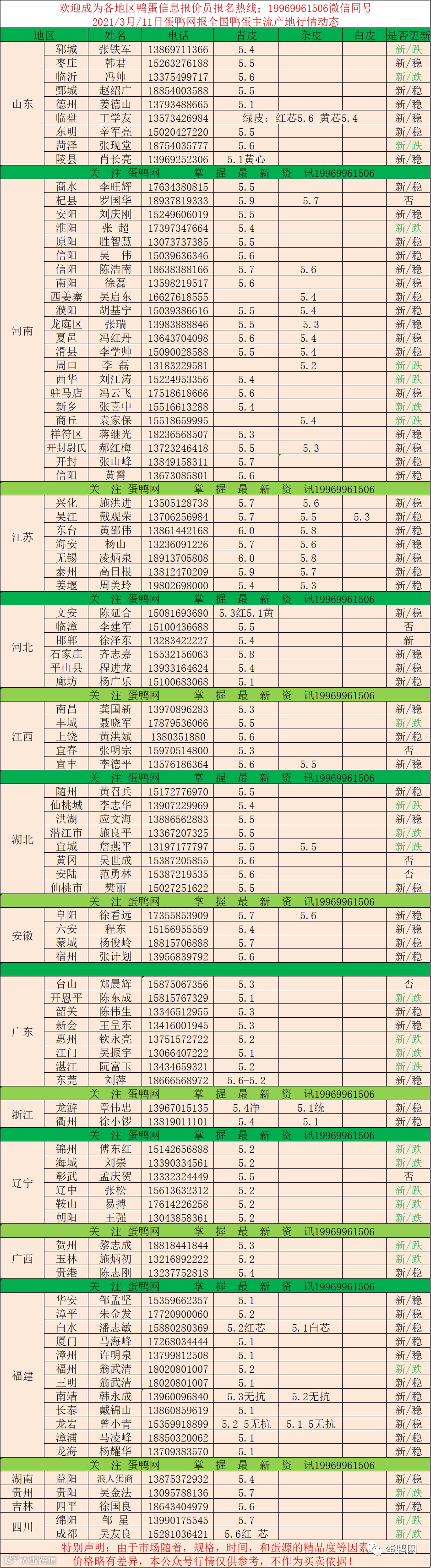 2021年3月11日鲜鸭蛋价格:初产至大蛋5.2(鸭蛋价格仅供参考)。