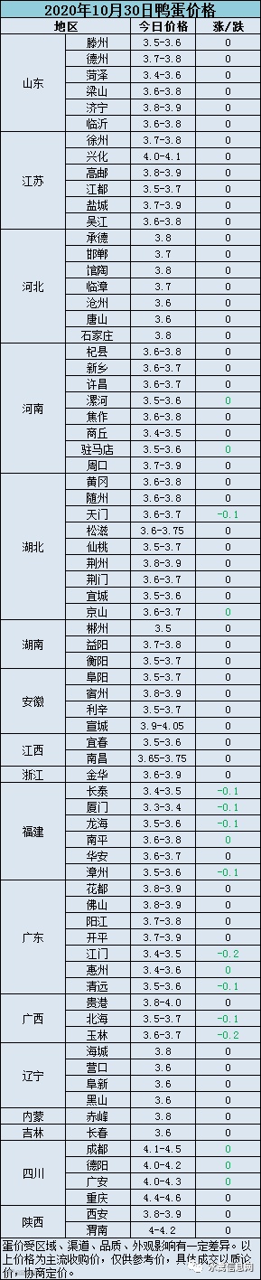 今日蛋价综述:今日鸭蛋市场报价持续下滑。低价区均价3.5元/斤,高价区均价3.8元/斤。