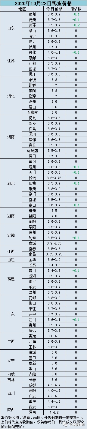 2020年10月28日淘汰蛋鸭价格参考值:活禽6-6.8元/斤、屠宰4.8元/斤。受肉鸭活禽价格下跌影响叠加淘鸭增多种鸭淘汰乱市,淘汰蛋鸭持续弱势震荡,走货较慢。