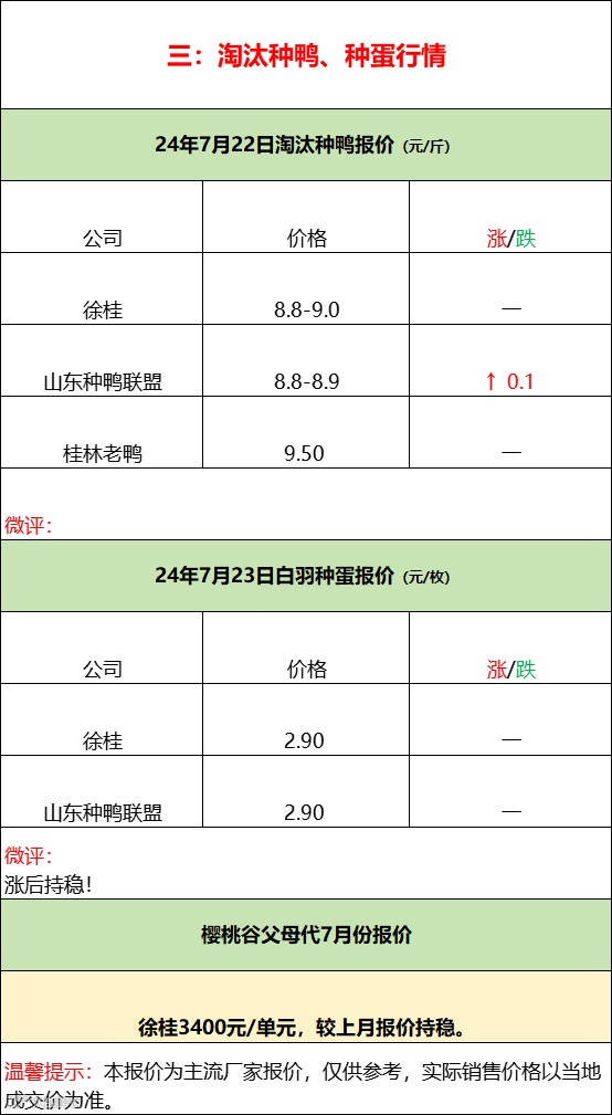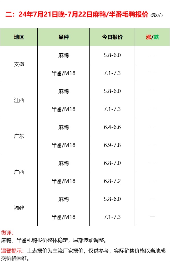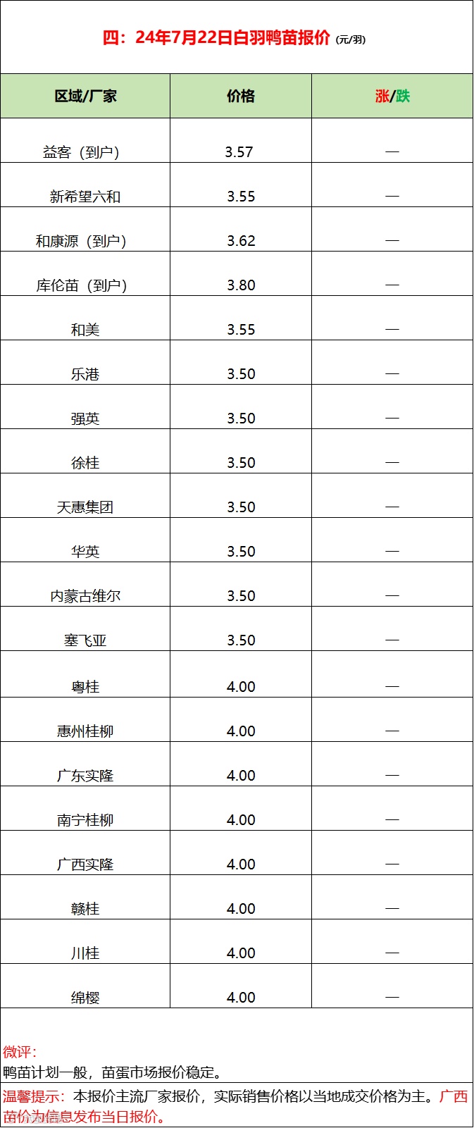 苗蛋报稳调整,副产品零星推涨;--2024年7月23日水禽行情简报 益牧堂水禽信息