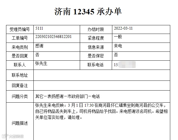 3月1日17:30,张先生乘坐商河至怀仁的102路公交车时,不慎将物品落在车上,白玉静师傅帮忙找回物品。特意来电感谢白玉静师傅。