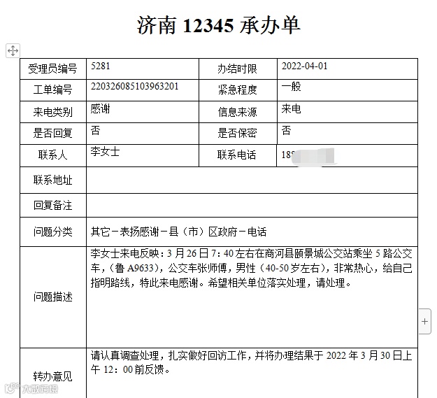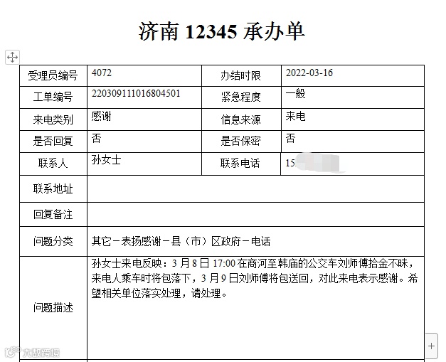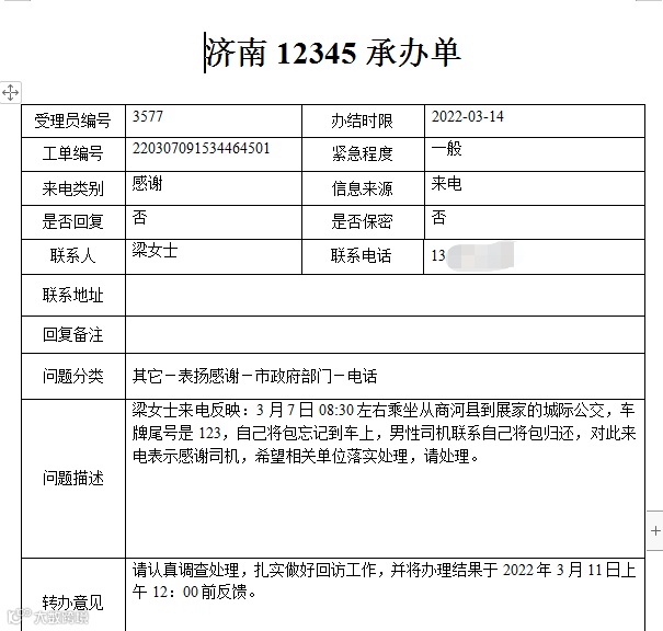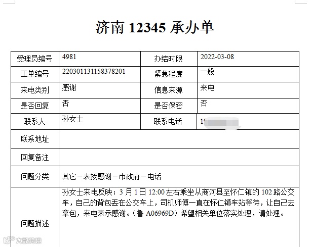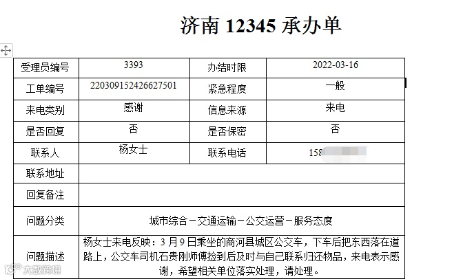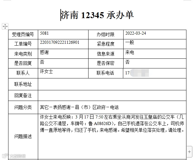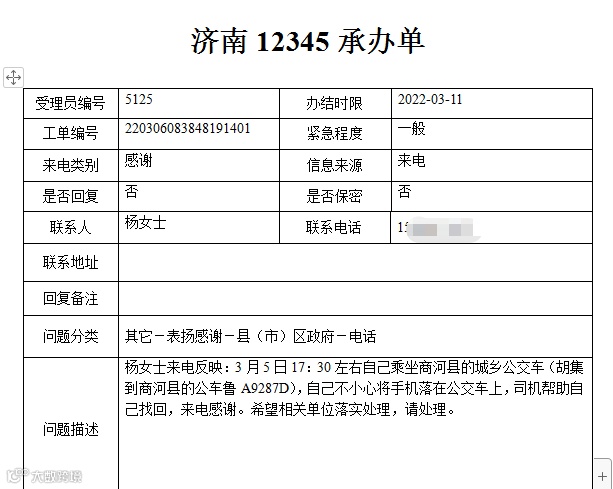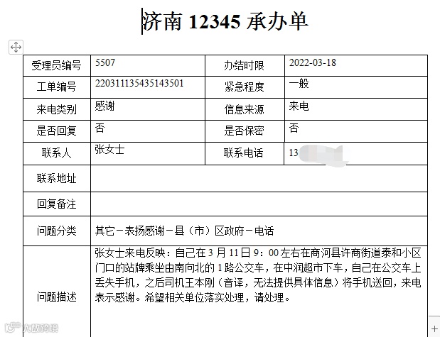 3月5日17:30左右,杨女士在乘坐商河至胡集103路公交车时,不小心将手机落在公交车上,张太涛师傅帮助找回,特地来电感谢。