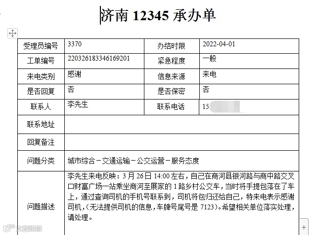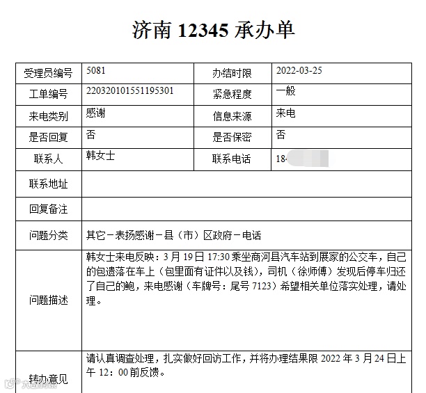 3月26日14:00左右,李先生乘坐商河至展家101路公交车时,将手提包落在了车上,通过查询找到了许振右师傅的联系方式,许师傅将包包归还给自己,特来电表示感谢。