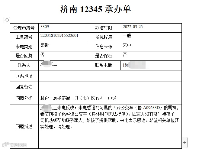 春节前孩子在乘坐5路开发区公交车时,因家人没有及时接到孩子,张宗炳师傅热心帮助联系家人,给孩子提供了很大的帮助,贺女士特地来电表示感谢。