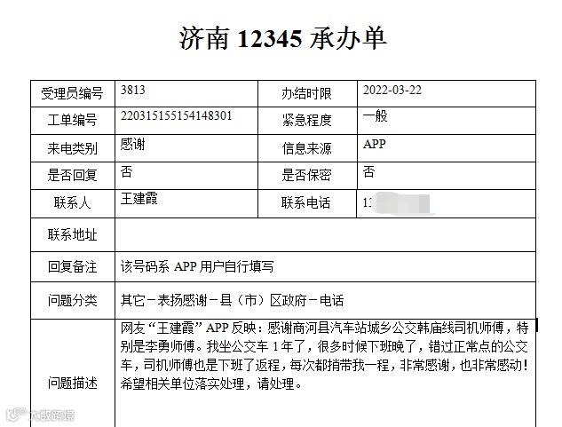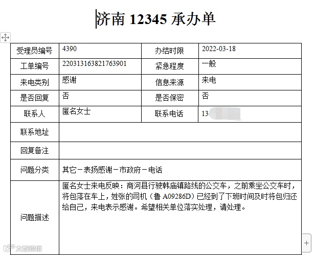 一位乘客在乘坐商河至韩庙105路公交车时,不慎将包落在了车上,热心的张福海师傅已经到了下班时间但还是及时将包归还给自己。特意来电表示感谢。
