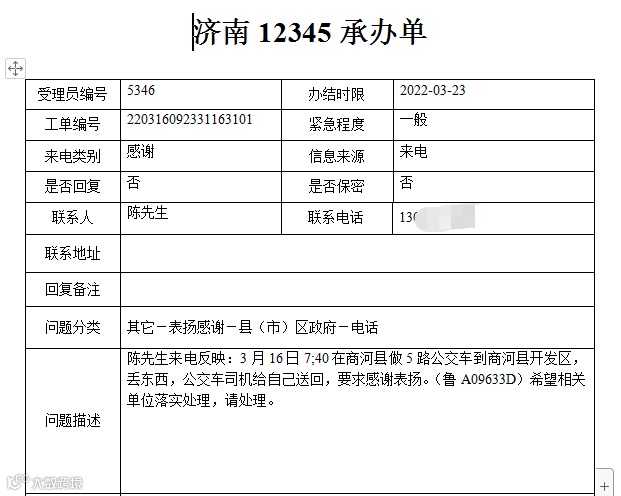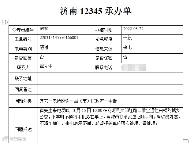 3月15日10:00,崔先生在商河县夕阳红路口乘坐通往白桥的城乡公交,下车时不慎将手机落在车上,路来财师傅联系到自己家属归还手机,崔先生特地来电表示感谢。