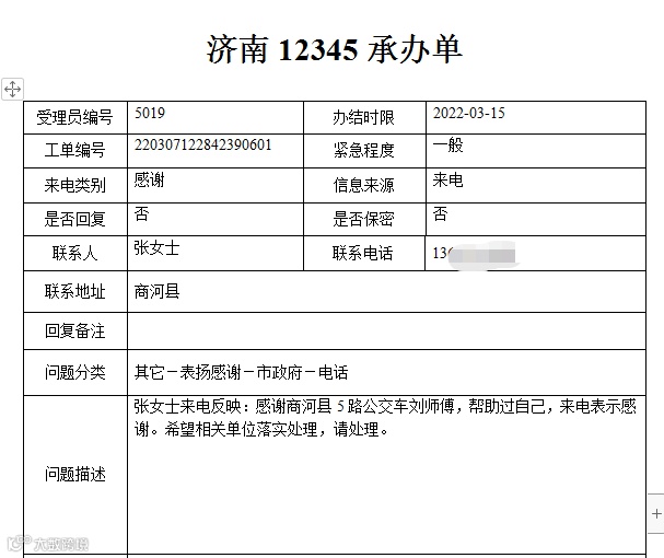 张女士来电感谢:感谢5路开发区的城乡公交刘继升师傅,帮助过自己,来电表示感谢。