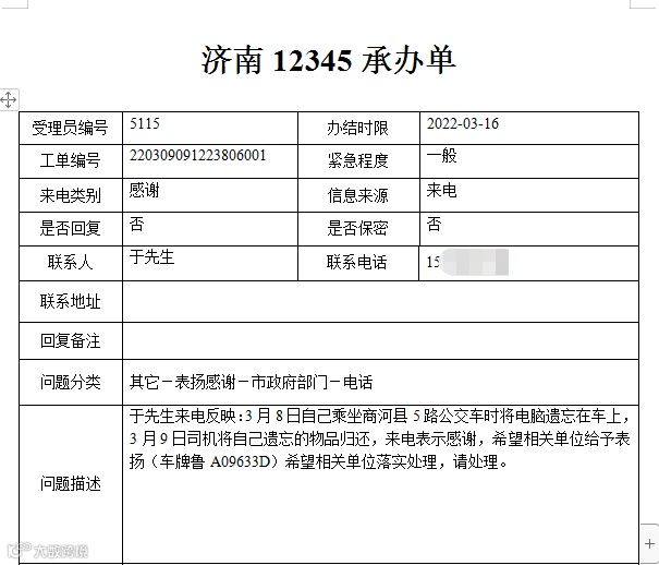 3月8日,于先生在乘坐商河5路开发区公交车时,不慎将电脑遗忘在车上。张宗炳师傅发现后主动联系自己,在3月9日将电脑归还。于先生表示非常感谢,特意来电表示感谢。