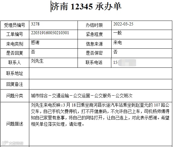 3月18日,刘先生在乘坐商河到赵奎元的107路公交车时,手机欠费停机,打不开健康码,按照防疫规定不亮码不允许上车。杨玉龙师傅得知自己家里有急事,热情地为自己打开个人热点,给自己连上,刘先生对此表示非常感谢。