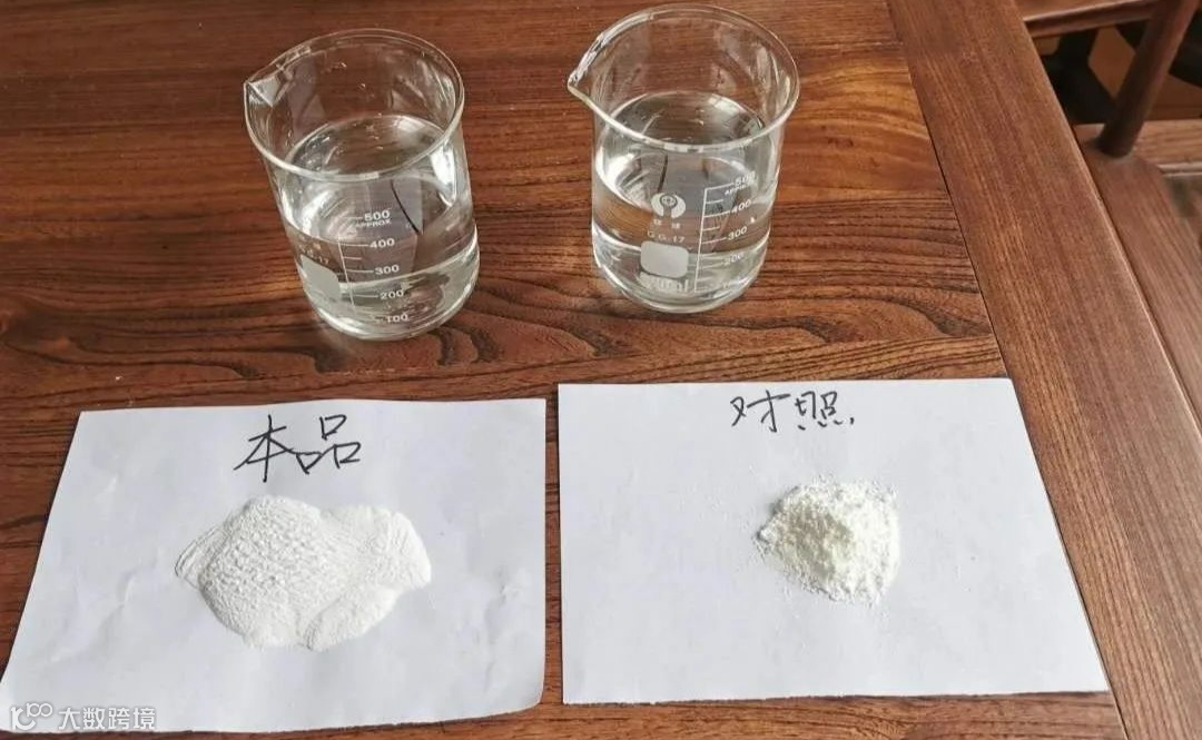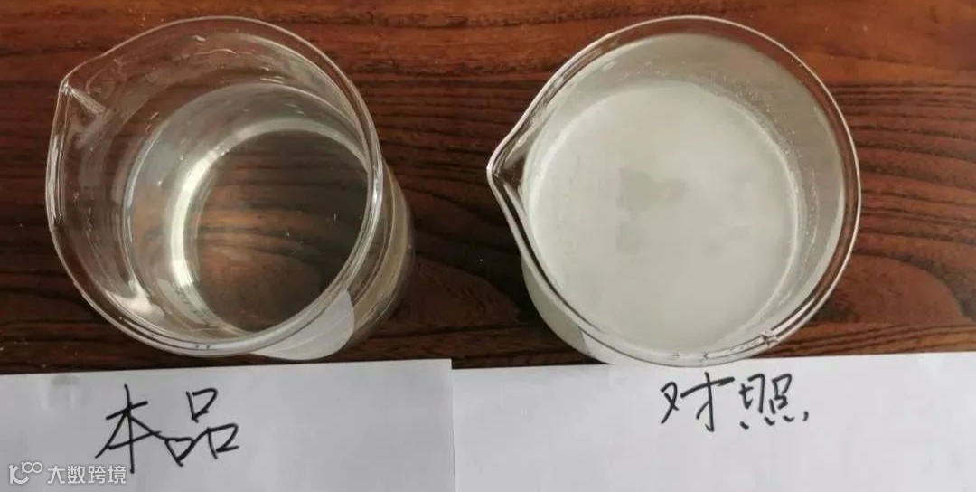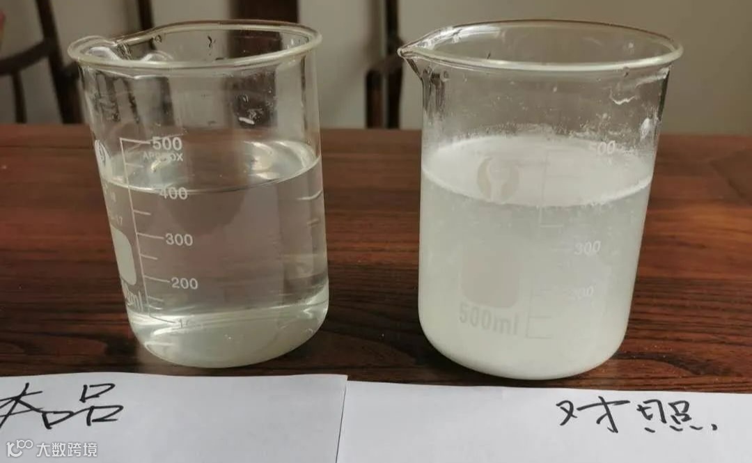 搅拌溶解5分钟后,本品与对照组溶解的情况对比