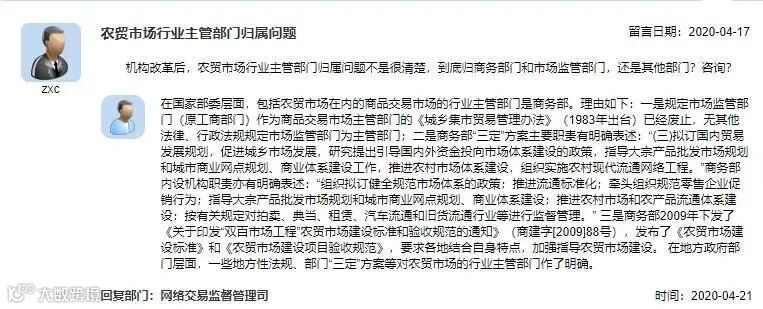 今年4月17日,一则总局留言问到,“机构改革后,农贸市场行业主管部门归属问题不是很清楚,到底归商务部门和市场监管部门,还是其他部门?”。